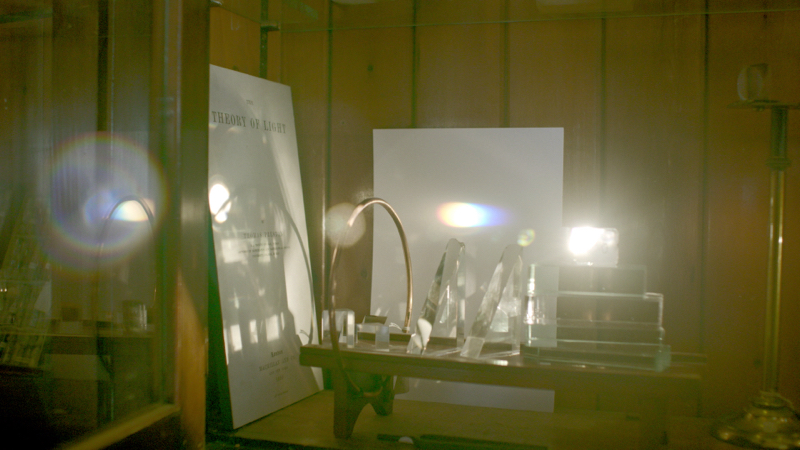“A Reflection of Light opens with a shot that defines the parameters of this spectral world. Fixed on a view of a square in Dublin, the camera lens is refocused to pull back through a windowpane. The image warps and buckles, suddenly nothing more than a wave of light, until the camera settles within the room. It’s a moment that renders the material world superficial, a construct of the eye and a construct so deliberately crafted that we sense the artist’s direction behind the shot. The eye of the camera is the eye of the artist and the ‘I’ of the artist...The whole film is shaped by a series of long tracking shots that take us slowly around three buildings: the interior of an apartment owned by the artist Mainie Jellett, a gallery space at IMMA, and the department of physics at Trinity College…While these long shots heighten my awareness of linear time, something contrary is occurring too. The motion of the camera takes me to the notebooks of Mainie Jellett’s grandfather who invented a prism and then to a cubist painting by Mainie which contains a half shadow prism…Then, as Weir remarks that ‘Time splinters at each moment into the past and the present making a dark curve in space’, the film takes us through a curve in one of Mainie’s paintings to a gallery where Mainie’s work is part of an exhibition on Cubism…The tracking shots may move us forward in a linear fashion but Weir demonstrates how we weave other dimensions of time and space into our daily consciousness…Perhaps what the film demonstrates is just how light, time and space are transformed as they pass through another medium: the lens of the camera. Grace Weir, has linked the ‘I’ of the maker to the eye of the camera as she rotates a work through time and space. Her film elaborates something…which is the perpetual motion of human consciousness: an ever-evolving perception and interpretation of the world around us.” Francis McKee